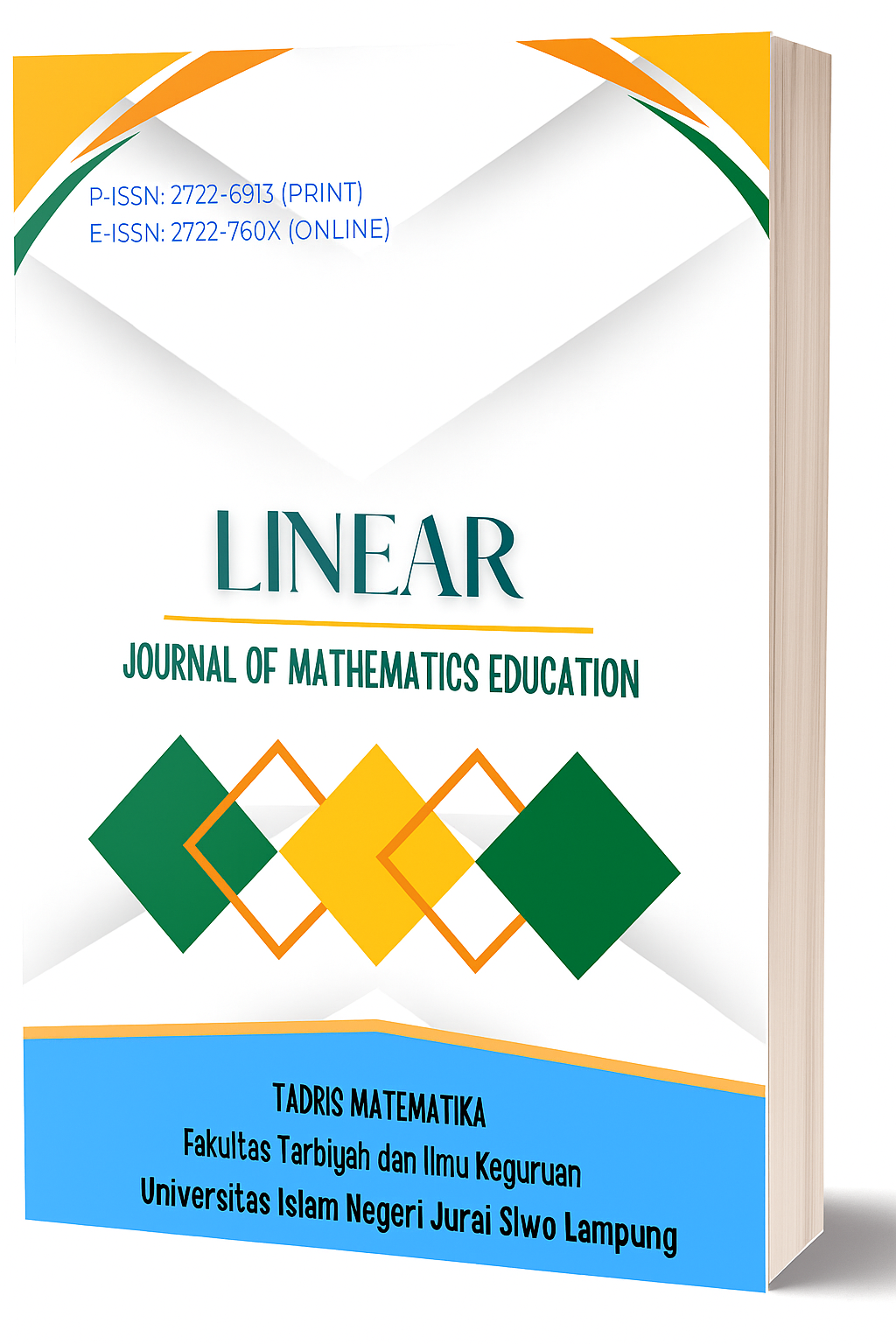 LINEAR: Journal of Mathematics Education with registered number p-ISSN: 2722-6913 (print), e-ISSN: 2722-760X (online), is a scientific journal in the field of mathematics education was established in 2020, published twice a year (in June & Desember). The aim of this journal is to publish high quality research in mathematics education including teaching and learning, instruction, curriculum development, learning environments, teacher education, educational technology, educational developments, from many kinds of research such as survey, research and development, experimental research, classroom action research, etc.